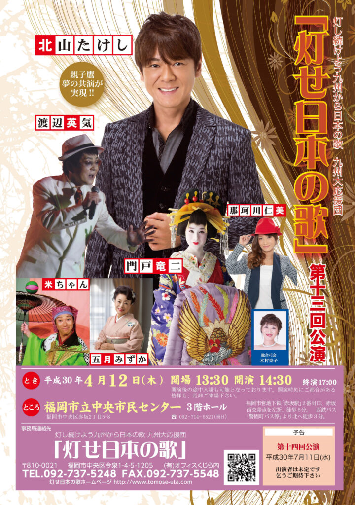 詳しくは【オフィスくじら内 「灯せ日本の歌」事務局(TEL 092-737-5248)】までお問合せください。