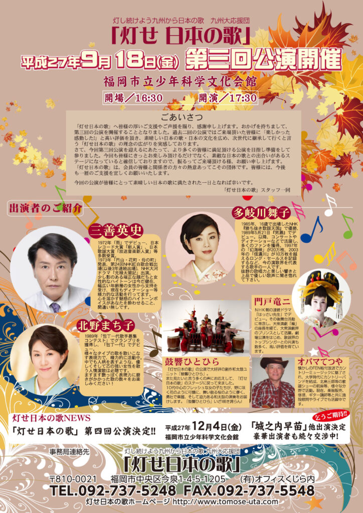 詳しくは【オフィスくじら内 「灯せ日本の歌」事務局(TEL 092-737-5248)】までお問合せください。