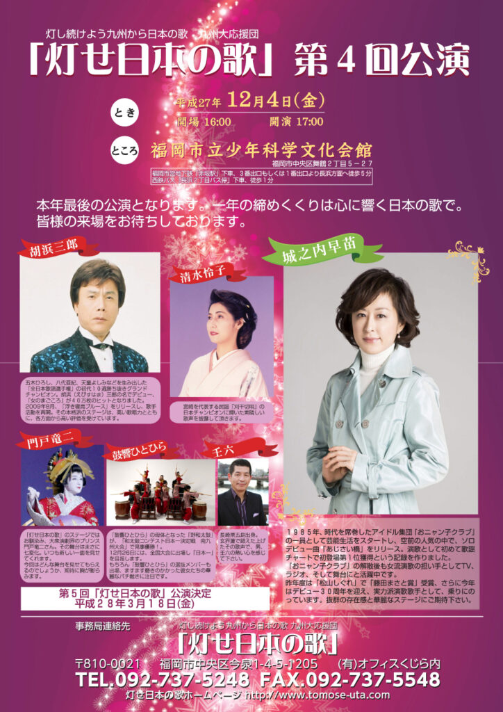 詳しくは【オフィスくじら内 「灯せ日本の歌」事務局(TEL 092-737-5248)】までお問合せください。